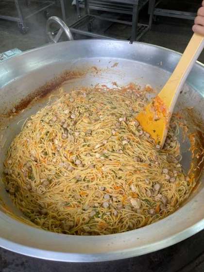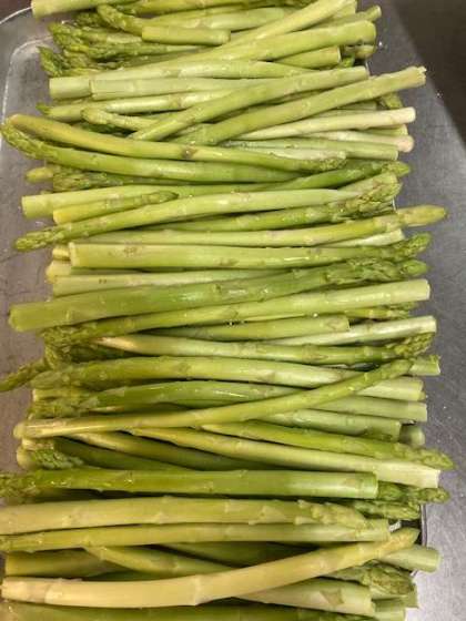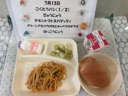 今日の給食は「チキントマトスパゲッティ、グリーンアスパラガスとキャベツのサラダ、発酵乳」でした。夏が旬のグリーンアスパラガスを蒸して、キャベツと合わせ、砂糖・塩・ワインビネガーで味付けしました。スパゲッティは、チキン、トマトのほかにウインナー、たまねぎ、にんじん、ピーマンが入った具沢山のスパゲッティで、子どもたちに大好評でした。