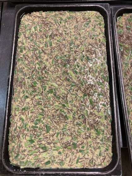 今日の給食は、「もずく入りヒラヤーチー、豚肉とあつあげの煮もの、あっさりきゅうり」でした。ヒラヤーチーとは、沖縄の家庭料理で「平焼き(平たく焼く)」という意味の料理です。卵と小麦粉を混ぜて作った生地に、にらともずく、旨味にかつおぶしを加えて焼きました。そこに、みりん、しょうゆ、酢で作ったタレをかけています。調理員さんに、切り分けて配缶していただきました。