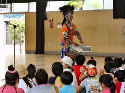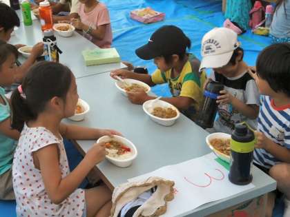 8月18日(日)に子ども会主催のデイキャンプがありました。当日は、カレー作り、アフリカンダンスの体験、うちわ作りなどをしました。当日は、約140名の参加がありました。子どもたちは、子ども会の担当の方から玉ねぎの切り方を教えてもらったり、うちわの色付けを指導してもらったりと多くのことを学びました。