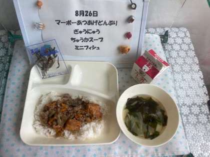 今日から2学期の給食が始まりました。献立は、「マーボーあつあげ丼、中華スープ、ミニフィッシュ」でした。丼は、ひき肉の他、なすやたまねぎが入りあつあげでボリュームを出し、中華スープは、わかめとたけのこの入ったあっさりとしたスープでした。
