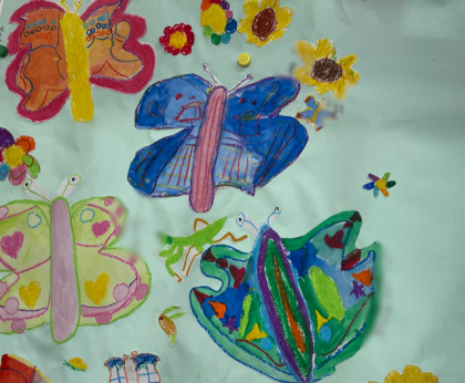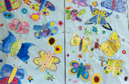 教室に子どもたちの描いた生き物がいっぱい