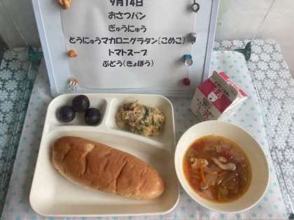 今日の給食は、「豆乳マカロニグラタン」でした。小麦・乳アレルギーに配慮した献立で、豆乳、米粉が使われています。また、使用している写真のマカロニは米粉で作られています。上にかけるパン粉も米粉のパン粉を使用しています。デザートは、旬の種なしの巨峰でした。一人3粒でしたが、とても甘く好評でした。