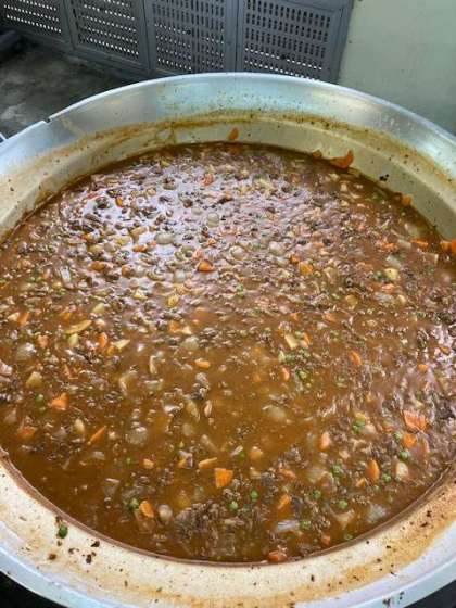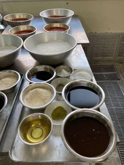 普段のハヤシライスは、小麦粉で作ったルウを使いとろみをつけますが、今日は、小麦アレルギーの児童に配慮し。米粉を使ってとろみをつけています。トマトピューレ、ケチャップ、砂糖、塩、こしょう、ローレル、トンカツソース、ウスターソース、しょうゆ、チキンブイヨン、とたくさんの調味料を使って、こくのある味に仕上げ、子どもたちに大好評でした。デザートのさくらんぼ(缶)は、給食用に無着色のものを使っています。
