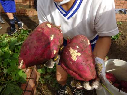 2年生全員でさつまいもほりをしました。「大きいのがほれた!」「こんなかわいいのもほれた!」「わぁ秋の虫もいる。」と口々に叫びながら、たくさん収穫できました。手は土まみれでしたが、笑顔はさつまいもに負けないくらい元気でした!