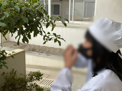 給食室の前で給食委員会の子ども達が係の活動をしていました。