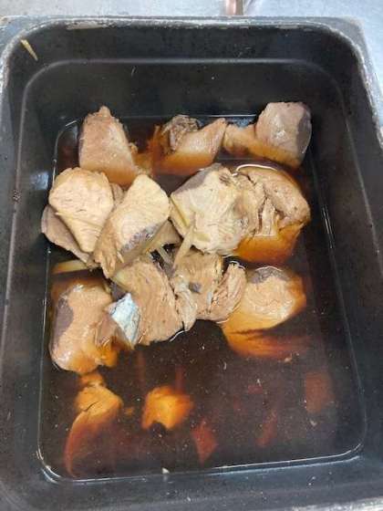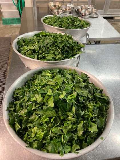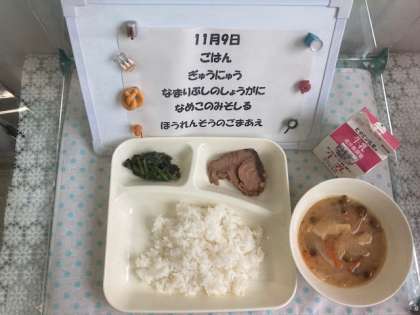 今日の給食は「なまりぶしのしょうが煮、なめこのみそ汁、ほうれんそうのごまあえ」でした。なまりぶしとは、かつおを加熱し燻製したものです。(燻製を何度も繰り返し、干すとかつお節になります)崩れやすいので、クラスごとのバットに入れ、調味料を加えて調理しています。ほうれんそうは、冷凍ではなく、生のものを使用しまし。大量のほうれんそうは下処理がとても大変ですが、とても美味しく、好評でした。
