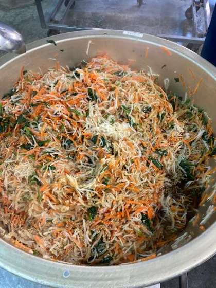 今日の給食は「ビビンバ、わかめスープ、アーモンドフィッシュ」でした。ビビンバは、韓国・朝鮮料理のひとつで、子どもたちに人気の献立です。牛豚のひき肉を甘辛く炒めたものと、だいこん・ほうれんそう・もやし・にんじんで作ったナムルをご飯に混ぜ合わせて食べます。衛生面に配慮し、肉と野菜は別々に配缶しています。
