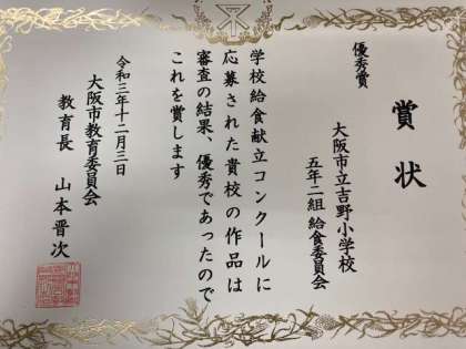 5年2組の給食委員会の児童が、令和3年度学校給食献立コンクールに応募し、優秀賞を受賞しました!献立は「野菜たっぷりカラフルうライス、キャベツときのこのスープ、ぶどう(巨峰)」です。来年度2学期の給食に実際に登場する予定です。とても楽しみです!職員室前に写真を掲示してますので、是非、ご覧ください。