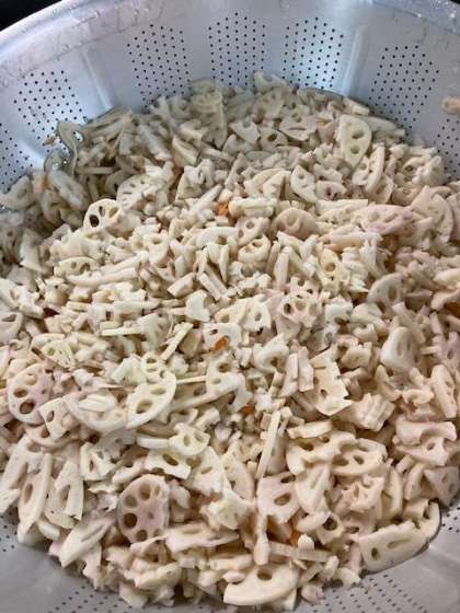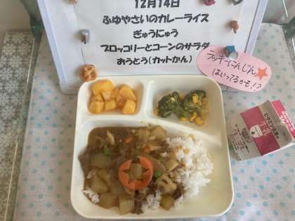 12月14日は「冬野菜カレーライス」でした。毎年、年1回登場するカレーです。いつものカレーはじゃがいもが入りますが、今回はその代わりに、冬野菜のれんこん、だいこん、それにしょうがが入っていました。とてもおいしく、心も体もポカポカになりました!