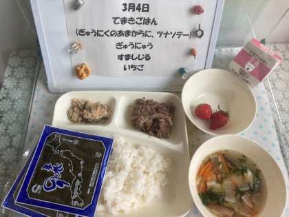 今日の給食は、6年生の卒業をお祝いする「卒業祝い献立」でした。牛肉の甘辛煮とツナソテーの2つの具を手巻きのりにご飯と一緒にのせて食べる「手巻きごはん」に、すまし汁、デザートにいちごがつきました。手巻き用の大判ののりは、2袋(10枚)あり、みんなたっぷりと、手巻きご飯を楽しんで食べることができました。