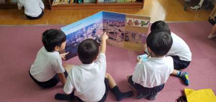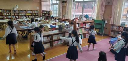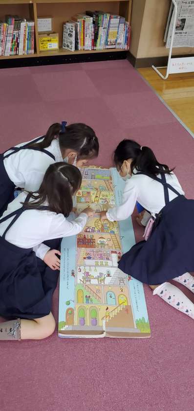 今日の2時間目、図書館での1年生の様子です。吉野小学校にはご覧のような大きな絵本があり、とても人気です。また先生に絵本を読んでもらっている子どももおり、思い思いに楽しく過ごしていました。