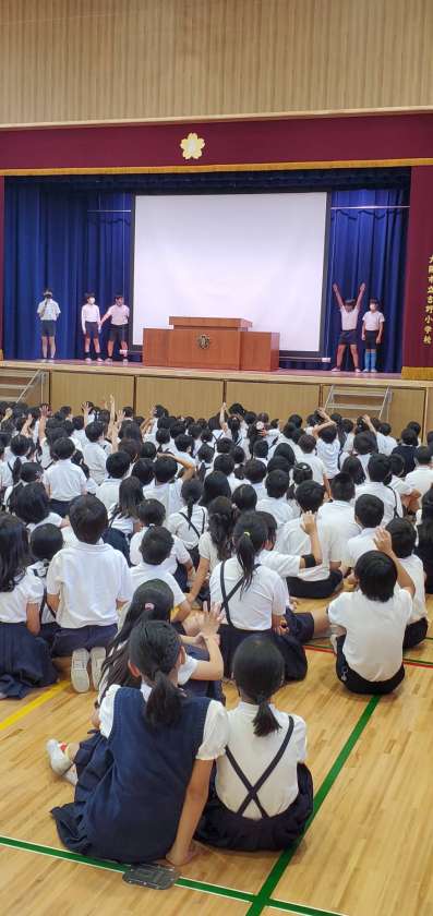 今日、講堂で今年度初めての児童集会を行いました。スクリーンの後ろに何人隠れているかを当てるゲームでしたが、集会委員の子どもたちが上手に場を盛り上げていて感心しました。