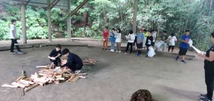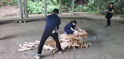 午後4時、レクリエーション係がキャンプファイアーの打ち合わせをしています。がんばって盛り上げてくださいね。