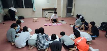 午後9時20分、生活班と活動班に分かれてリーダー会議を行い、今日1日を振り返りました。この後ここでの話し合いをもとに全員で今日の反省会をします。