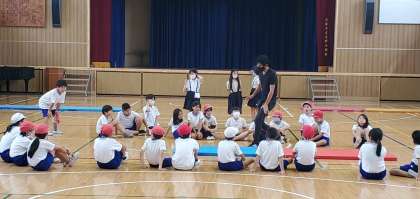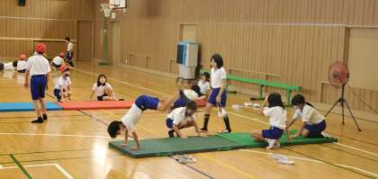 今日の6時間目、4年生が体育館でマット運動(側方倒立回転)の学習をしていました。お互いに教え合いながらがんばって練習していました。