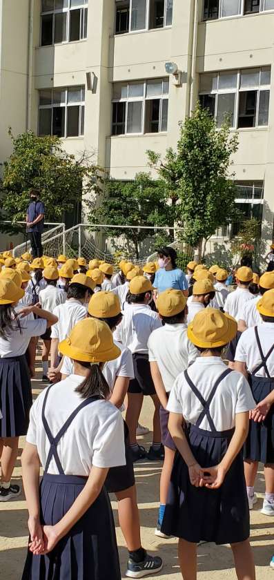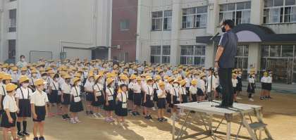 コロナの感染が落ち着きを見せてきており、また朝夕はずいぶん過ごしやすくなってきたので、今日から全校朝会を運動場で行う事としました。このまま減り続け、様々な取り組みが気兼ねなくできるようになっていってほしいと願うばかりです。