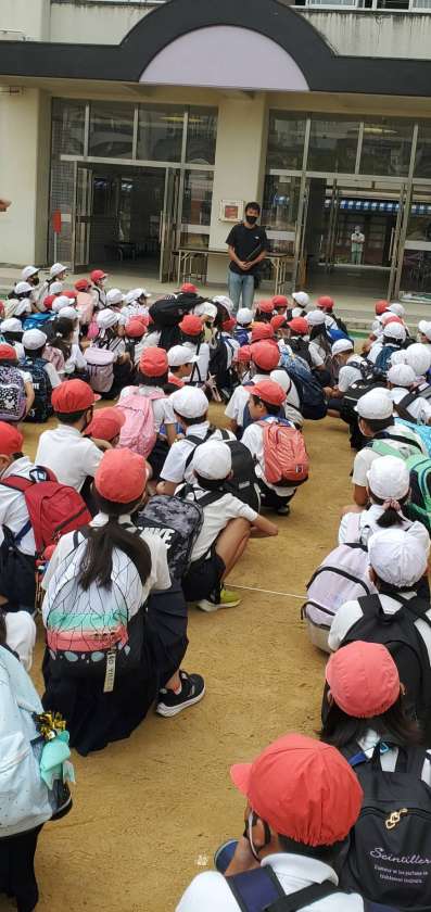 今日は3・4年生が鶴見緑地に遠足に出かけます。午前8時45分、予定どおりの時刻に学校を出発しました。