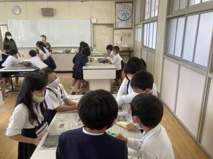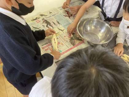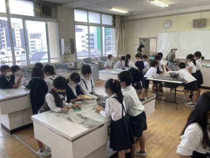 ご覧の写真は、2年生が自分たちで育てたさつまいもの調理をしている様子です。