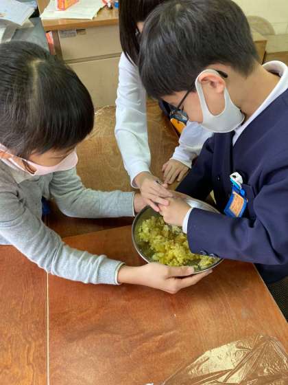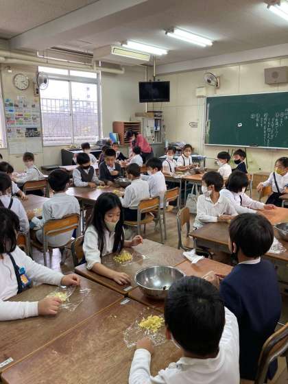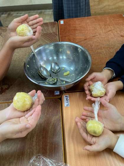 5時間目の様子です。午前中に調理したさつまいもをラップにくるんで形を作った後、いよいよお待ちかねの試食タイムです。