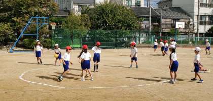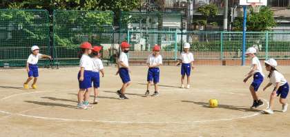 今日の1時間目、1年生が運動場で「ころがしドッジボール」の学習をしていました。涼しくなり、運動するのによい季節になりました。