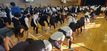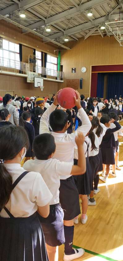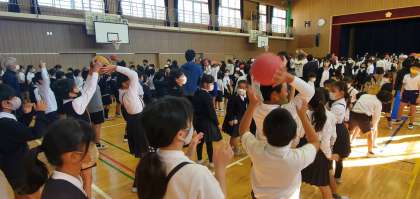 今日の児童集会は講堂で、ボール送りゲームをしました。久しぶりに体を使って行うゲーム、楽しそうな歓声があちらこちらから聞こえてきました。
