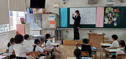 今日は1年2組の教室で、国語科の授業研究会を行いました。「サラダでげんき」を題材に、よりよい発表の仕方や聞き方について勉強しました。みんなとってもよくがんばっていました。