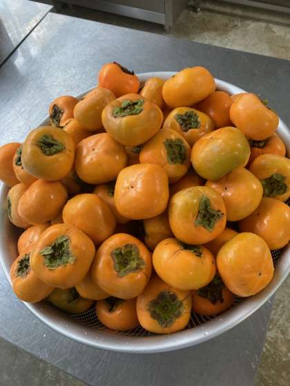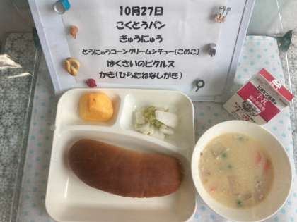 今日の給食は、「豆乳コーンクリームシチュー、はくさいのピクルス、平核無柿」でした。昨年は柿が不作で、給食には登場しませんでしたが、今年は旬の柿をおいしく食べることができました。クリームシチューは、小麦アレルギーの児童も食べられるように、米粉でとろみをつけています。少しあっさりした仕上がりでしたが、具沢山でおいしく、大好評でした。