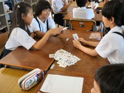 たんぽぽ活動は、1年から6年生までが28のグループに分かれて月1回活動しています。例えば、運動場で縄跳びや鉄棒を教室では、トランプやダルマ落としなどを学年を超えて楽しんでいます。