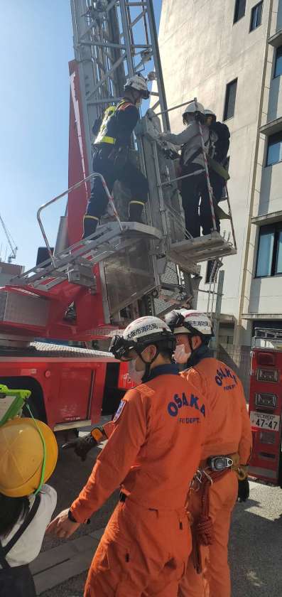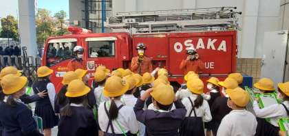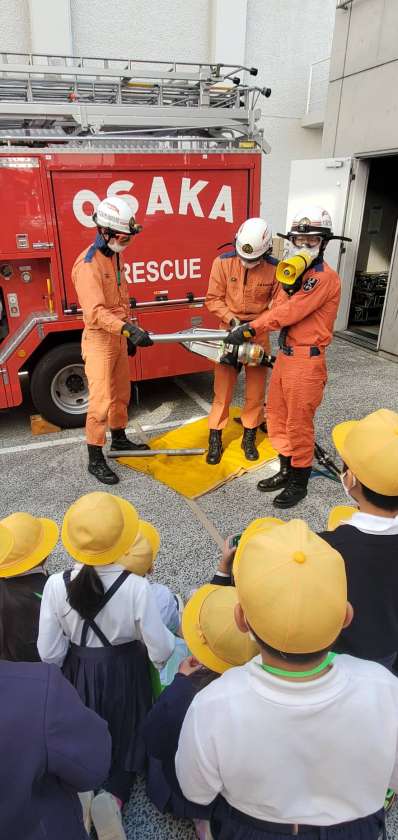 実際にはしご車のはしごを伸ばしていただいたり、鉄パイプを切る道具を見せていただいたりと、子どもたちが実感しながら学ぶことができるようご配慮いただきました。