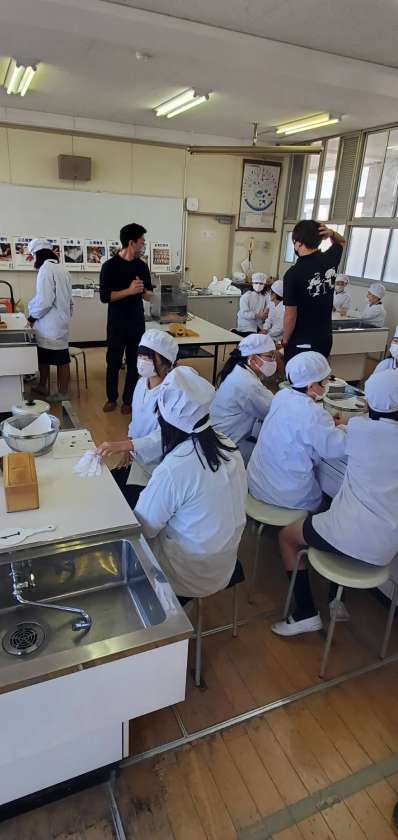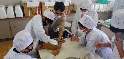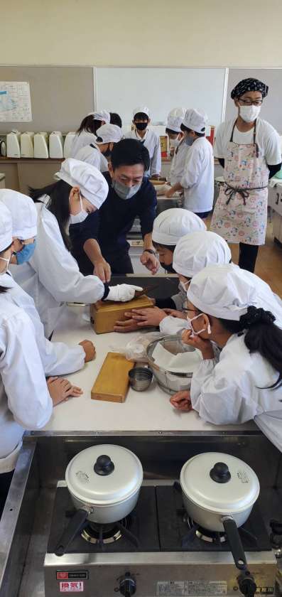今日、5年生がかつおぶし協会青年部の方々をゲストティーチャーにお招きし、ご飯と味噌汁を作っています。