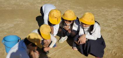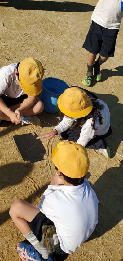 今日の5時間目、3年生が虫眼鏡を使って光を集める実験をしていました。