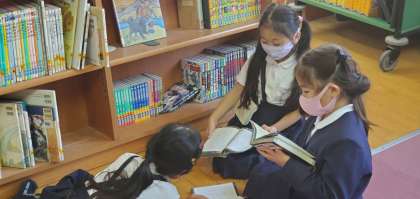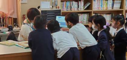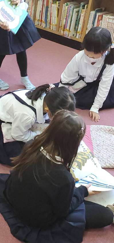 1年生の図書館での様子です。思い思いの場所で静かに本を読むことができています。毎週金曜日には図書館補助員の谷江先生が、本の整理や子どもたちのサポートをしてくださっています。