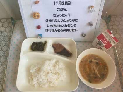 今日の給食は、「なまりぶしのしょうが煮、じゃがいものみそ汁、ほうれんそうのおひたし」でした。なまりぶしは、かつおの身をゆでて冷まし、骨や皮を取り除いた後、いぶして乾燥させたものです。今日は、なまりぶしにしょうが、砂糖、みりん、しょうゆ、酒を加えて煮ています。骨がないので食べやすく、おいしく仕上がっていました。