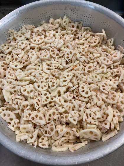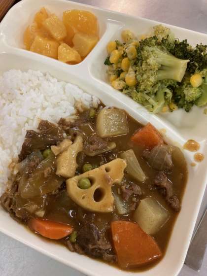 今日の給食は「冬野菜のカレーライス、ブロッコリーとコーンのサラダ、黄桃(缶)」でした。冬野菜のれんこんやだいこんがたっぷり入った、冬野菜のカレーライスは毎年好評な献立です。みんな、おいしそうに食べていましたよ!