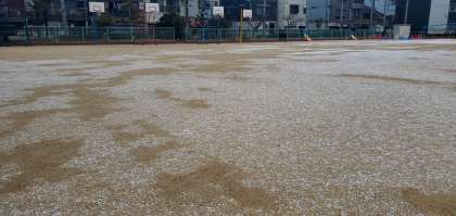 ところで下の写真は午前9時半頃の運動場の様子です。霜がおりているのがお分かりいただけるでしょうか。クリスマス寒波と言われていますが本当に冷え込んでいます。