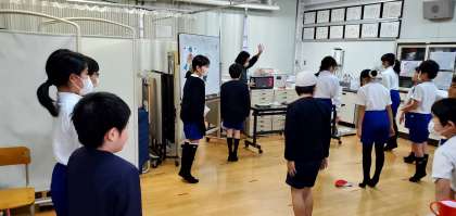 今、6年生から順に発育測定を行っています。ご覧の写真は、寒い時期でもあるので、測定前にその場でできる体のあたため方について学んでいる様子です。