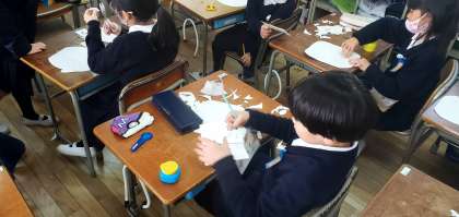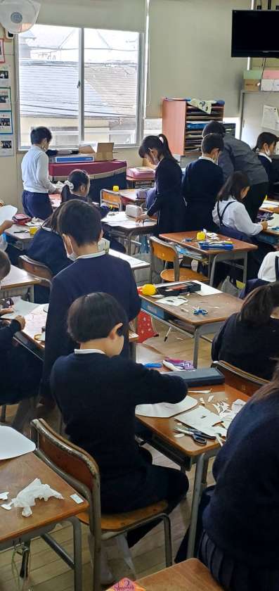 今日の3時間目、2年生が紙版画をしている様子です。自分の顔を作っています。思うとおりに出来たでしょうか?