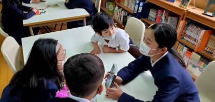 今日のお昼休み、図書館においてお互いが読んだ本について紹介し合うビブリオバトルを行いました。