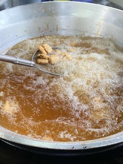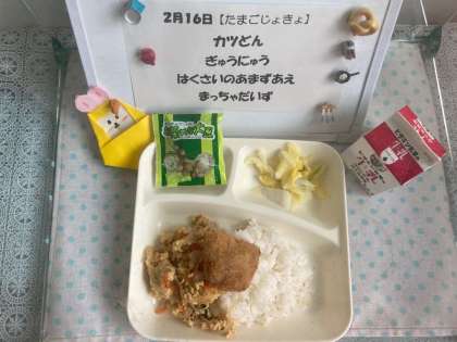 今日の給食は「カツ丼、はくさいのあまずあえ、まっ茶大豆」でした。カツ丼は、たまねぎやにんじんを卵でとじた具の上に、給食室で揚げたトンカツを添えています。カラっと揚がったトンカツと甘めの具がとても合い、大人気でした。大豆に抹茶をまぶしたまっ茶大豆は、中学校では数年前から登場していますが、小学校では初登場です。おいしかったかな?