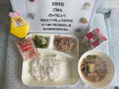 今日の給食は「豚肉のしょうが焼き、さつまいものみそ汁、なのはなのおひたし」でした。なのはなは春を感じる食材です。今日ははくさいと合わせておひたしにしていました。なのはなは少し苦みがありましたが、かつおぶしをかけて、美味しくいただきました。