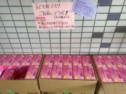 学校に備蓄していたマスクを玄関に置いています。必要な方は、取りに来てください。お子さんにお持ち帰りいただいても結構です。(一人一箱まで)