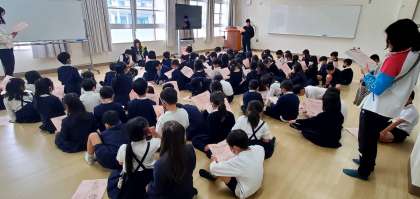 今日の5時間目、多目的室において、1年生が入学式に向けた練習をしていました。当日はひとつ年上の2年生として参加する予定です。ぜひかっこいい姿を披露してくださいね。