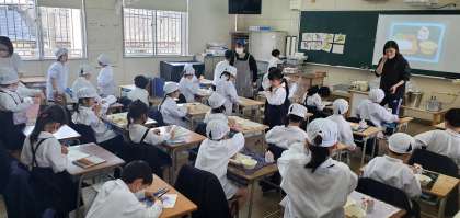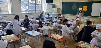 今日は今年度初めての給食です。上の2枚の写真は1年生の様子です。1年生はしばらくの間、他の学年より早目に準備をして食べます。