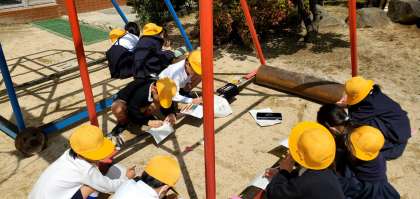 2年生が生活科の学習をしている様子です。見つけたことを一生懸命ノートにかき込んでいます。