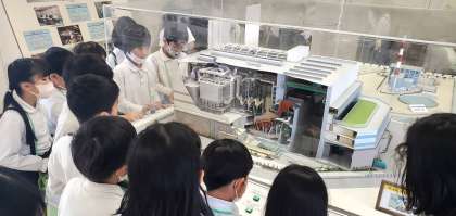 模型などを見せてもらいながら、工場内の様子などについて説明していただいています。