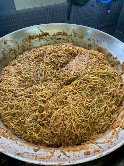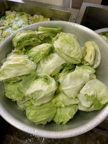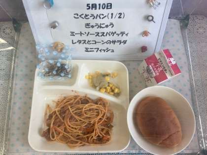 今日の給食は「ミートソーススパゲッティ、レタスとコーンのサラダ、ミニフィッシュ」でした。サラダは旬のレタスを使っていました。スパゲッティは手作りのブラウンルウの他にケチャップやソースで味付けしています。とてもおいしく大好評でした。