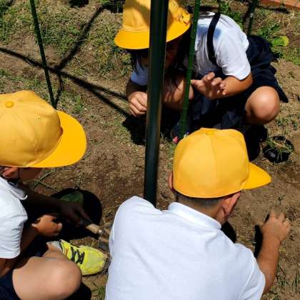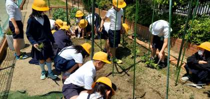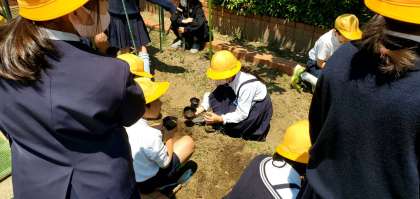 今日の3時間目、4年生が学習園にひょうたんの種を植えている様子です。前に苗も植えていますが、種からもしっかり育つようお世話してあげてくださいね。