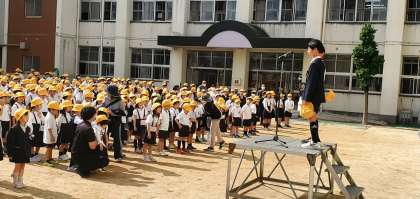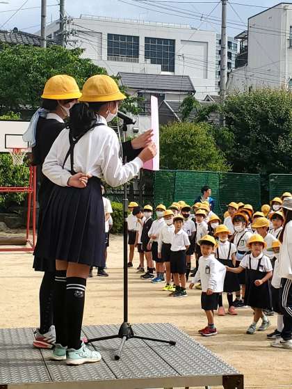 今日は運動場で朝会を行いました。先生方からのお話に加えて、健康委員会や給食委員会からのお知らせがありました。