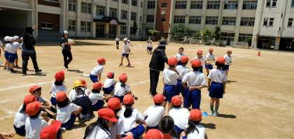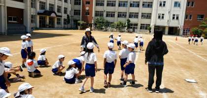 ご覧の写真は2年生が大玉運びの練習をしている様子です。(ただし今日は玉なしですが)