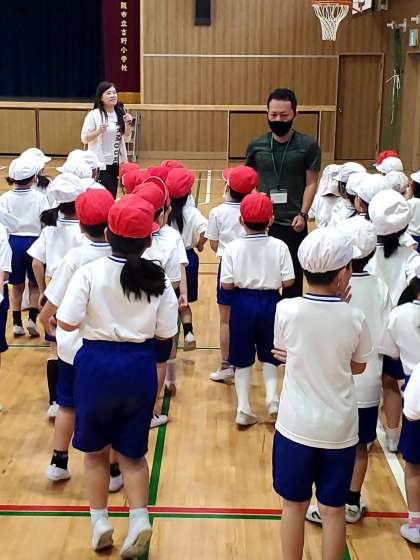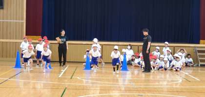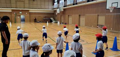 今日は雨で運動場が使えないので、体育館で練習しています。ご覧の写真は1年生かかけっこをしている様子です。